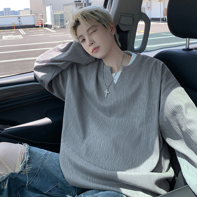 白色肌理感v领长袖t恤男女款秋季宽松慵懒风卫衣设计感内搭打底衫