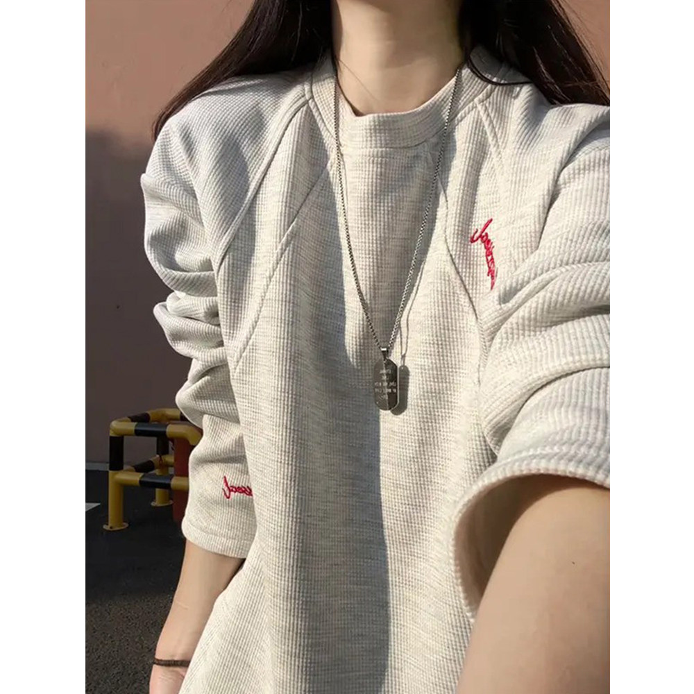 白花灰美式拼接刺绣卫衣男女款春秋季宽松休闲正肩长袖T恤打底衫