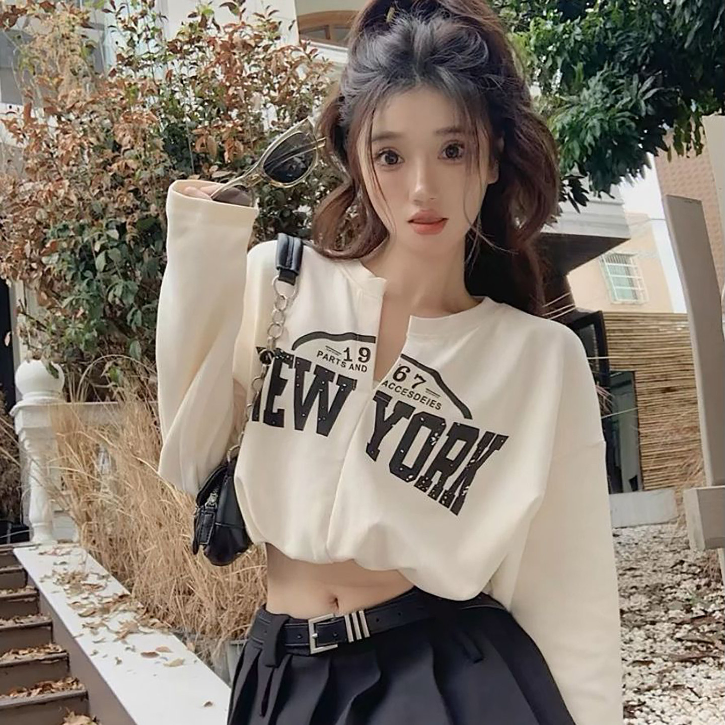 美式辣妹v领印花卫衣女款春秋季t恤衫宽松爵士舞高腰露脐短款上衣