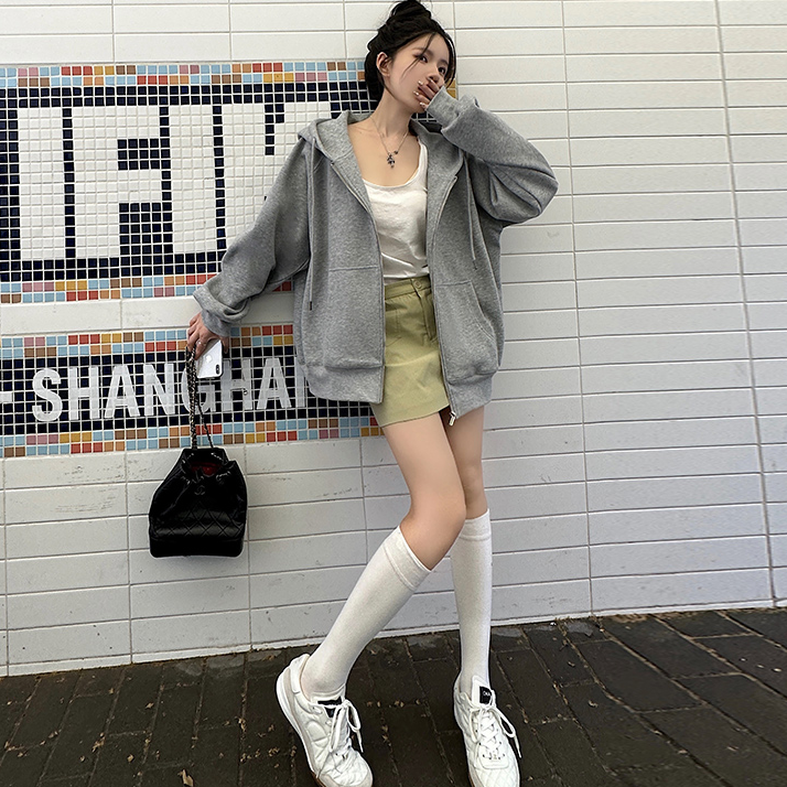 连帽卫衣女款春秋季2024新款宽松上衣女士小个子拉链开衫灰色外套