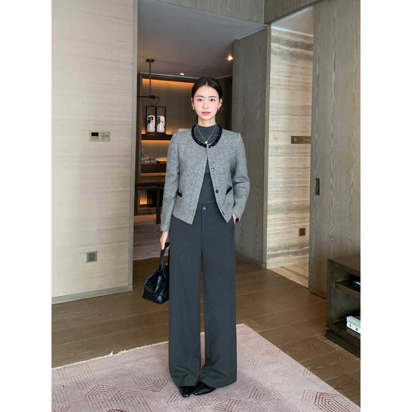 [黑天鹅套装]LANDI赫本风优雅通勤西装外套女微喇西裤2025春新品
