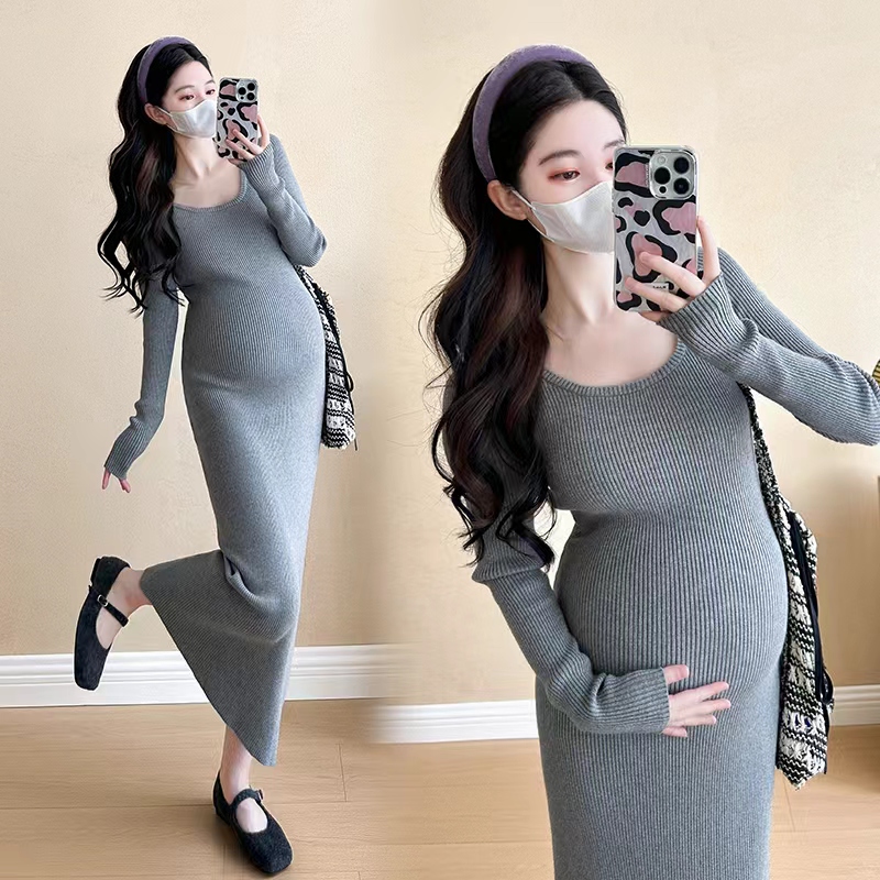 孕妇装秋冬季性感U型领纯色针织连衣裙修身显瘦百搭打底裙子春秋