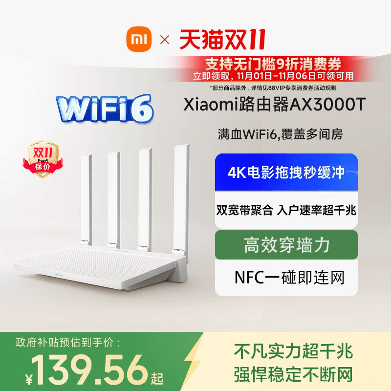 小米路由器AX3000T家用5G千兆端口WiFi6双频全屋覆盖大户型穿墙王