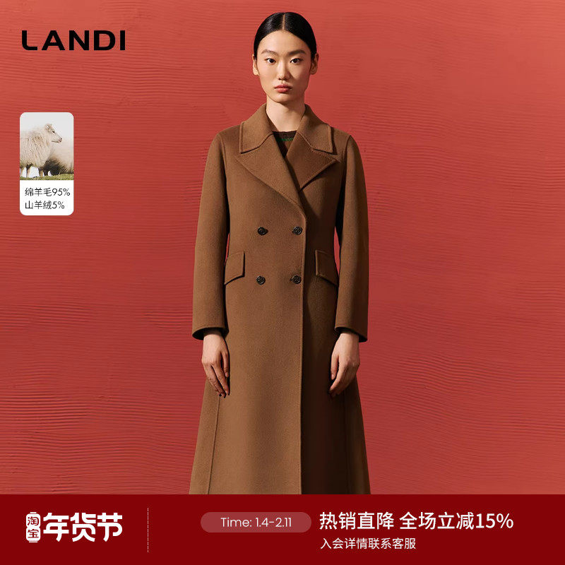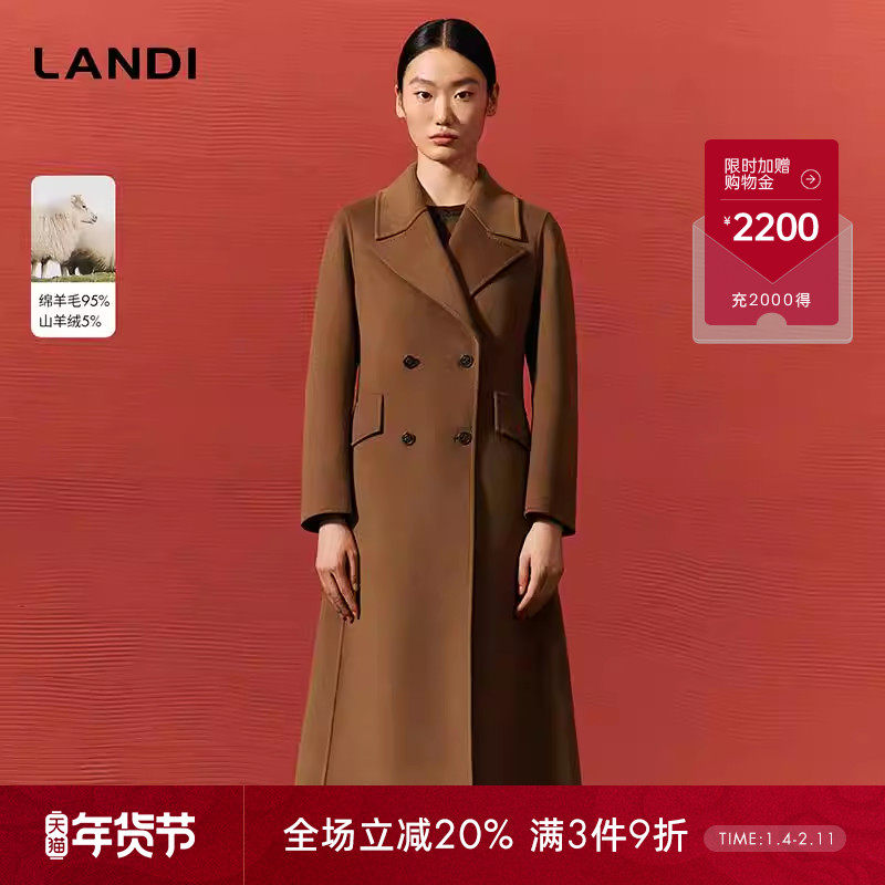 LANDI蓝地驼色羊毛羊绒混纺轻奢双排扣长款毛呢外套大衣女冬新品