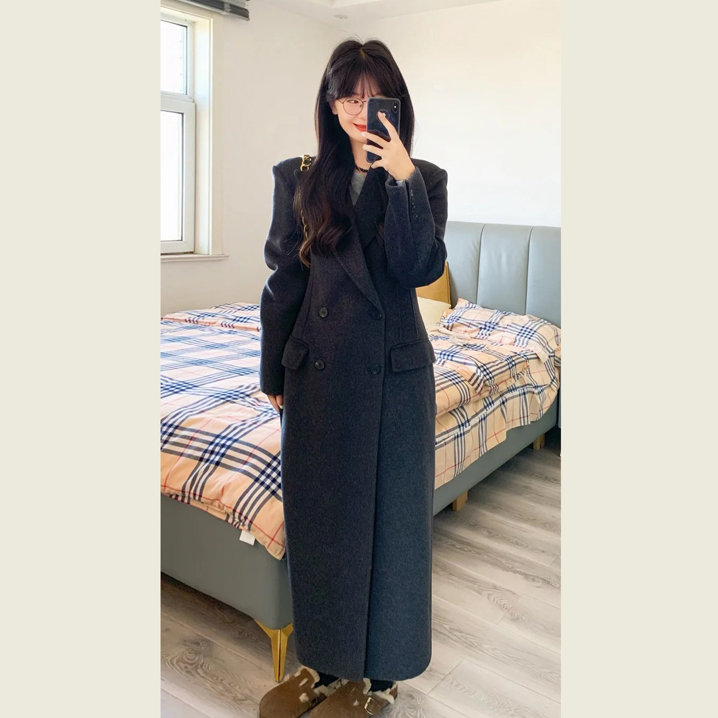 尺寸已更新韩国复古西装领双排扣长款毛呢外套冬季高级感呢子大衣