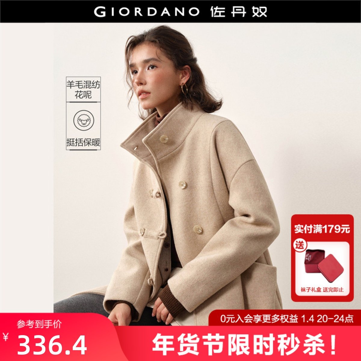 设计师款佐丹奴老钱风大衣女宽松立领双排扣长款毛呢外套18375721