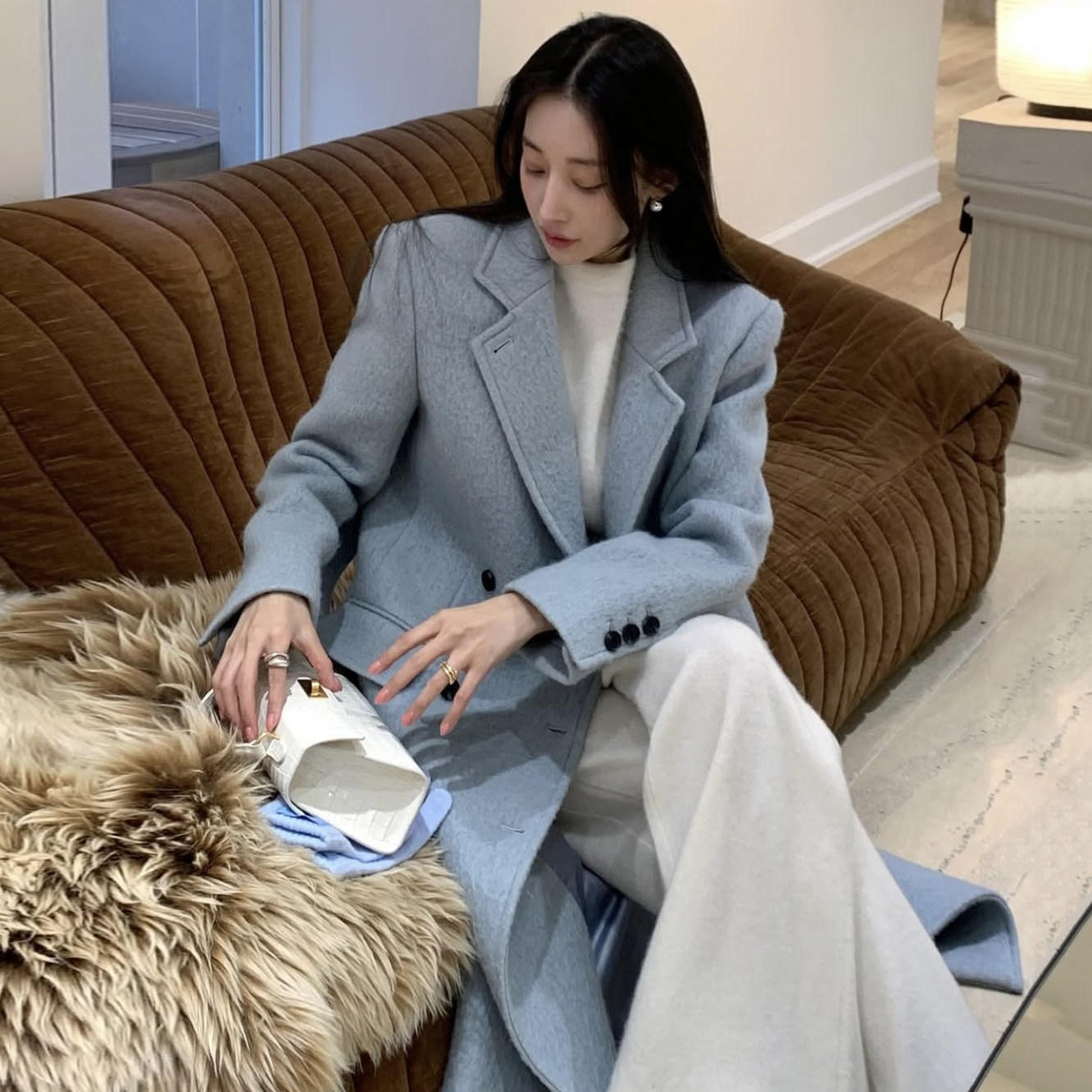 蓝色翻领双排扣毛呢外套女秋冬季气质休闲显瘦减龄中长款呢子大衣