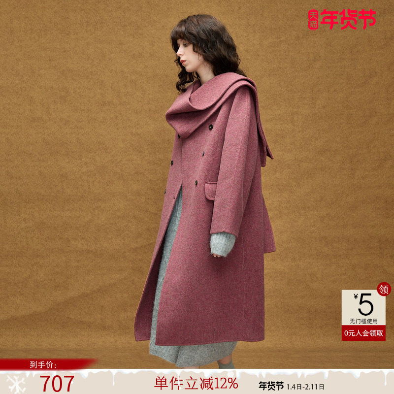 德玛纳绵羊毛围巾双面呢大衣女25冬季新款圆领双排扣长款毛呢外套