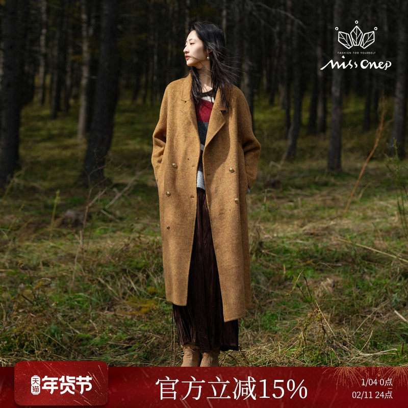 MissonepOL【赋冬呢】复古咖西装领双排扣长款毛呢外套女2025新款