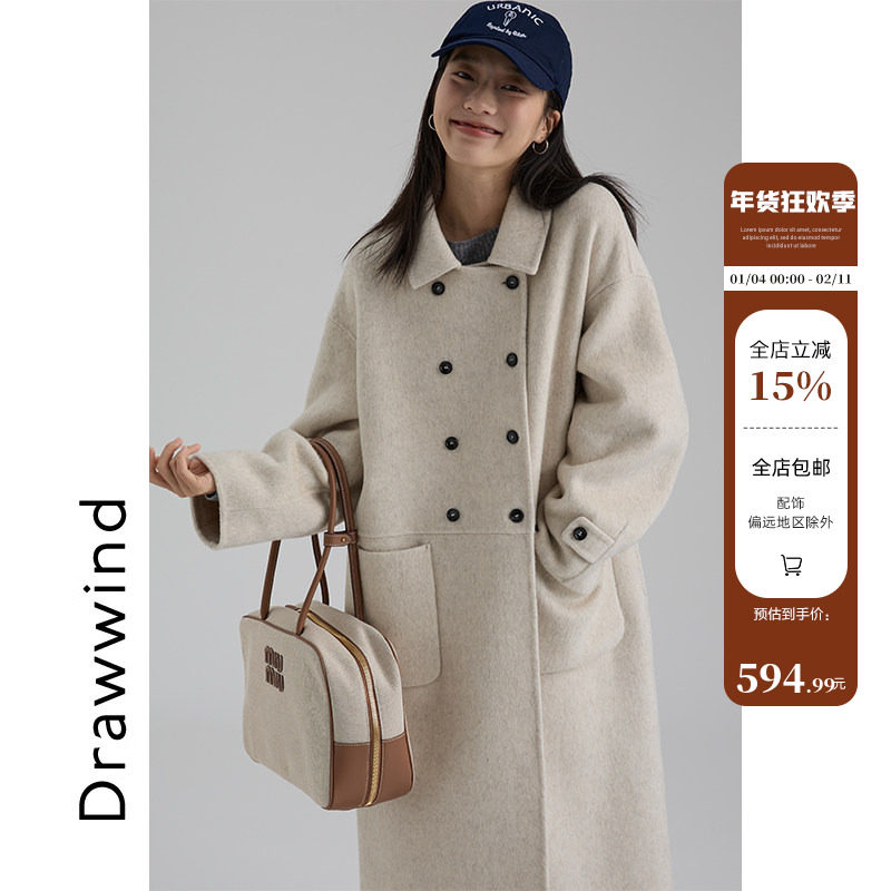 画风drawwind2025秋冬新款羊毛大衣女纯色翻领双排扣长款毛呢外套