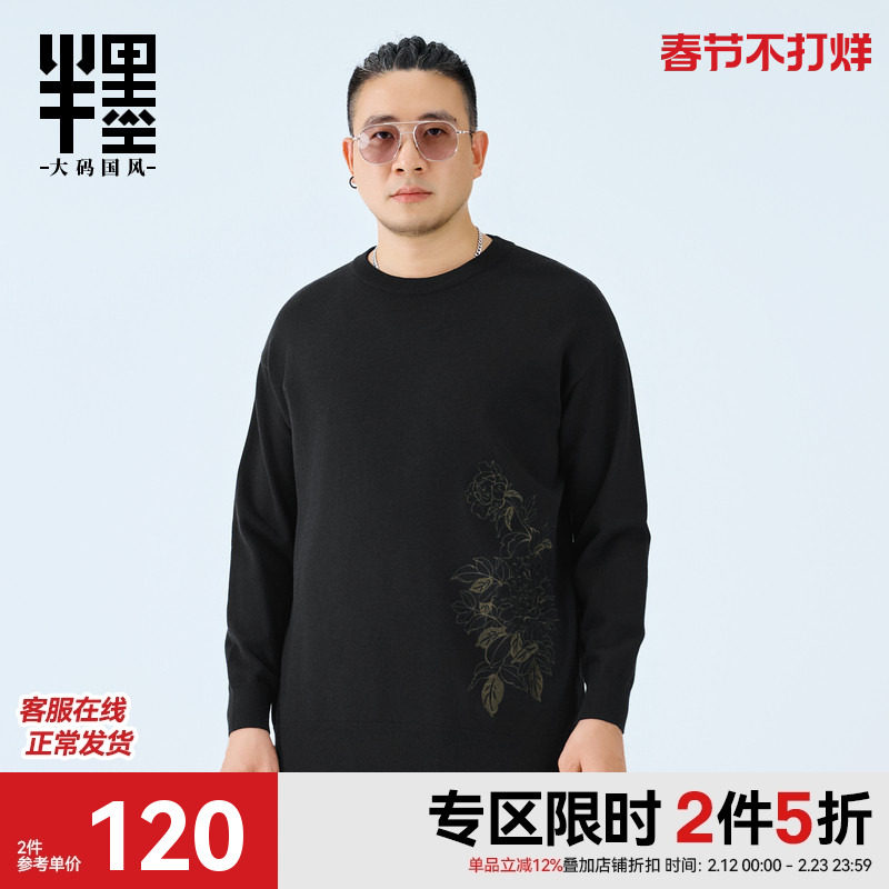 半墨大码男装新中式圆领毛衣男冬季中国风牡丹绣花复古针织毛线衫