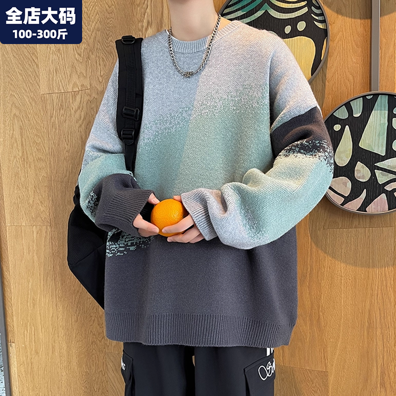 渐变色毛衣男套头圆领打底针织衫青少年宽松胖子加肥加大大码男装