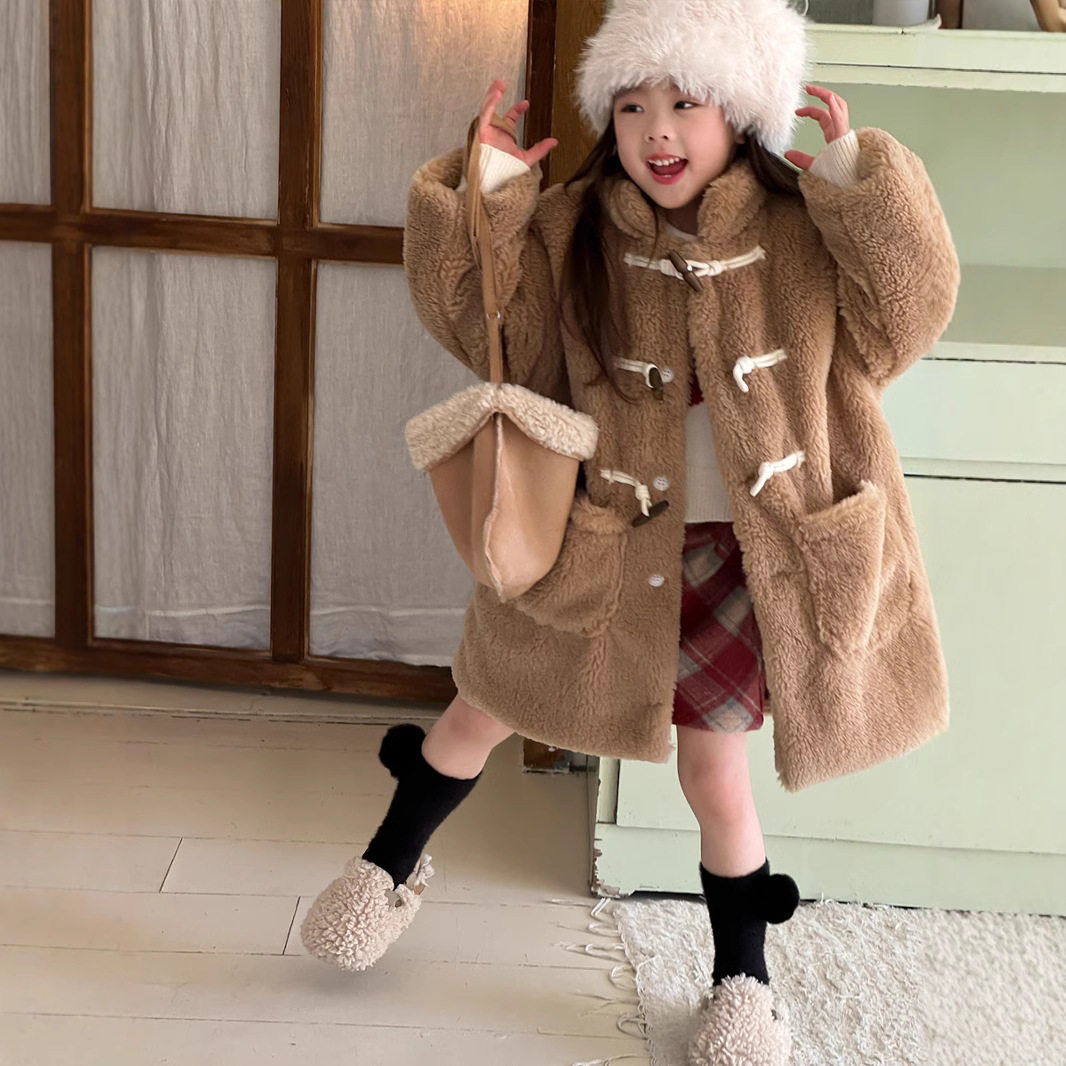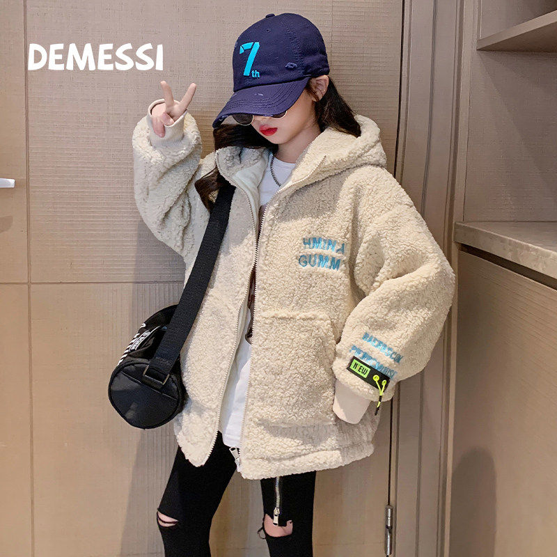 韩国DEMESSI女童连帽羊羔毛外套秋冬2025新款加厚保暖中长款大衣