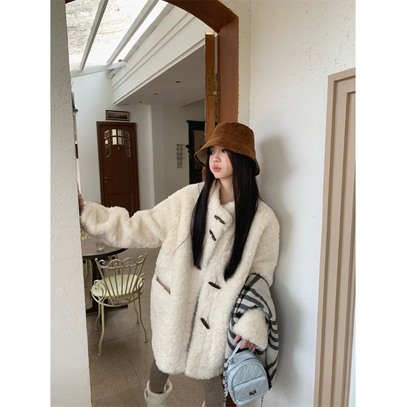 韩国东大门可爱减龄牛角扣连帽毛茸茸中长款羊羔毛皮草大衣外套女