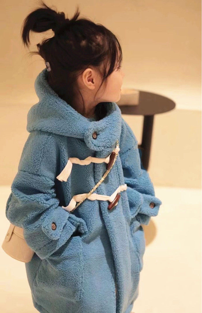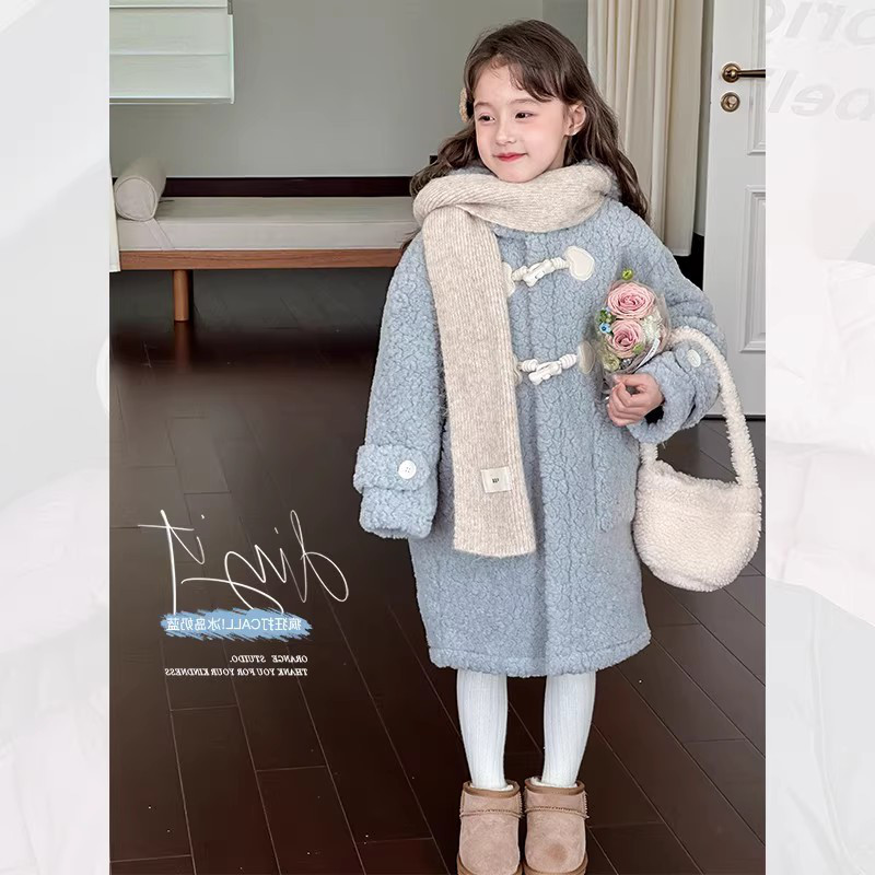 韩国版冬季新款女童气质羊羔毛牛角扣大衣儿童加厚夹棉中长款外套