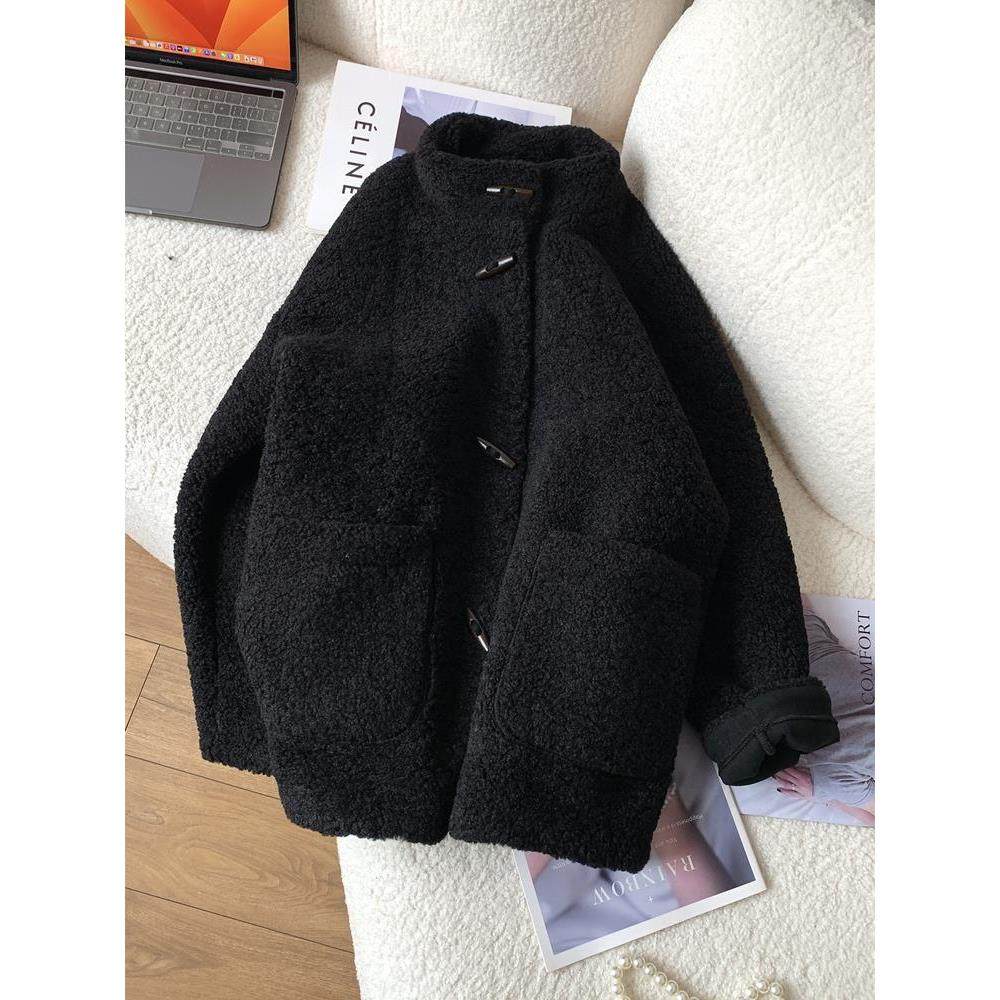 韩国加厚立领彷羊羔毛外套女中长款休闲牛角扣黑色立领派克服冬季