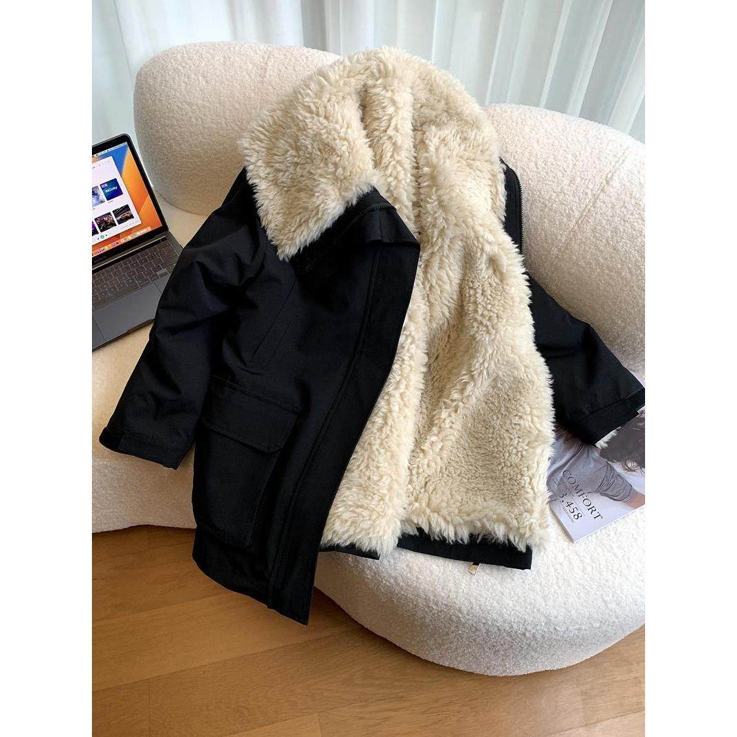 韩国工装外套女加厚加绒夹彷羊羔毛中长款皮毛一体派克服翻领冬季