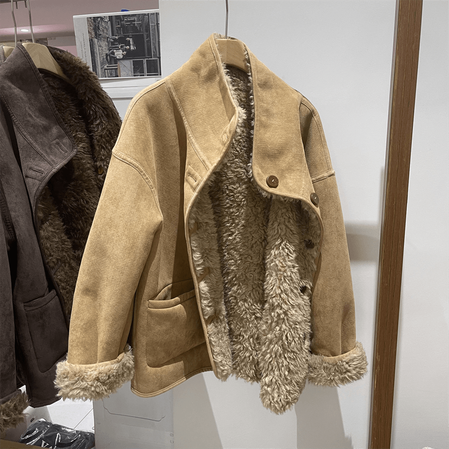 麂皮绒羊羔毛外套女秋冬2025新款宽松显瘦里外两穿中长款皮毛一体