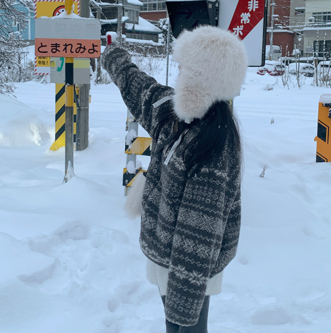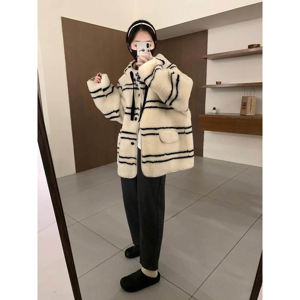 韩国2025冬新款连帽条纹彷皮毛一体羊羔外套女中长款宽松加厚大衣