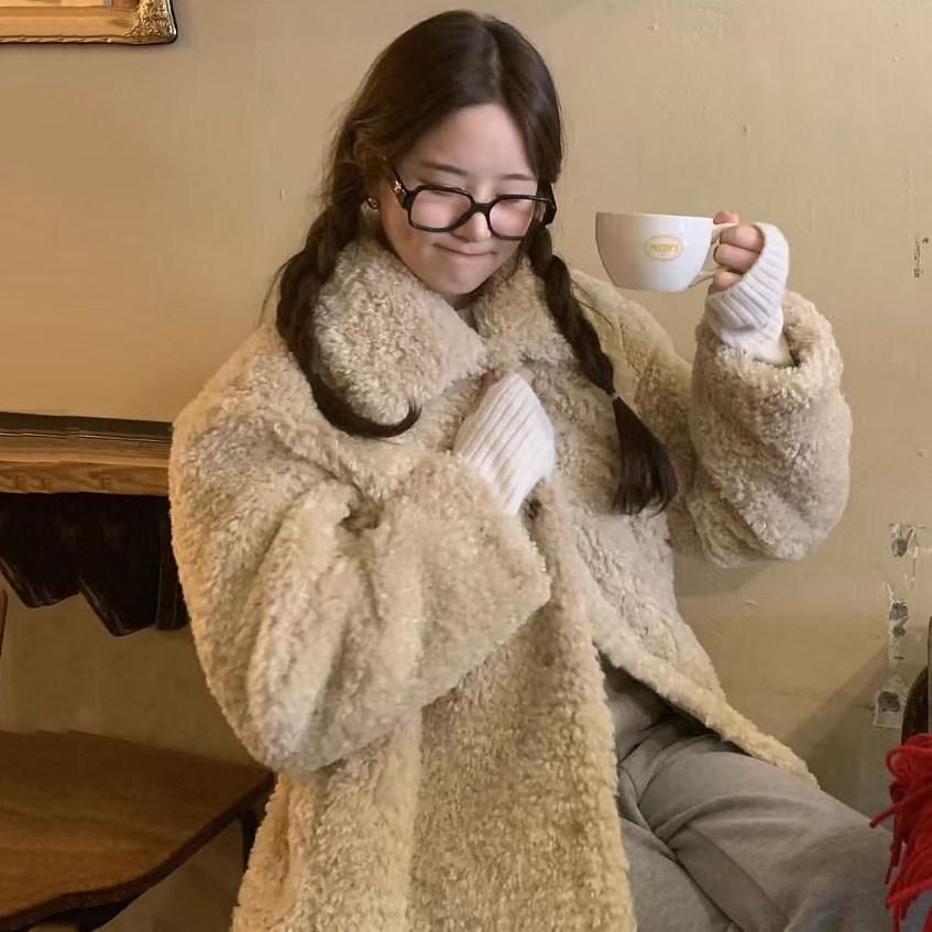 韩国东大门甜美减龄翻领毛茸茸中长款加厚保暖羊羔毛大衣外套女冬