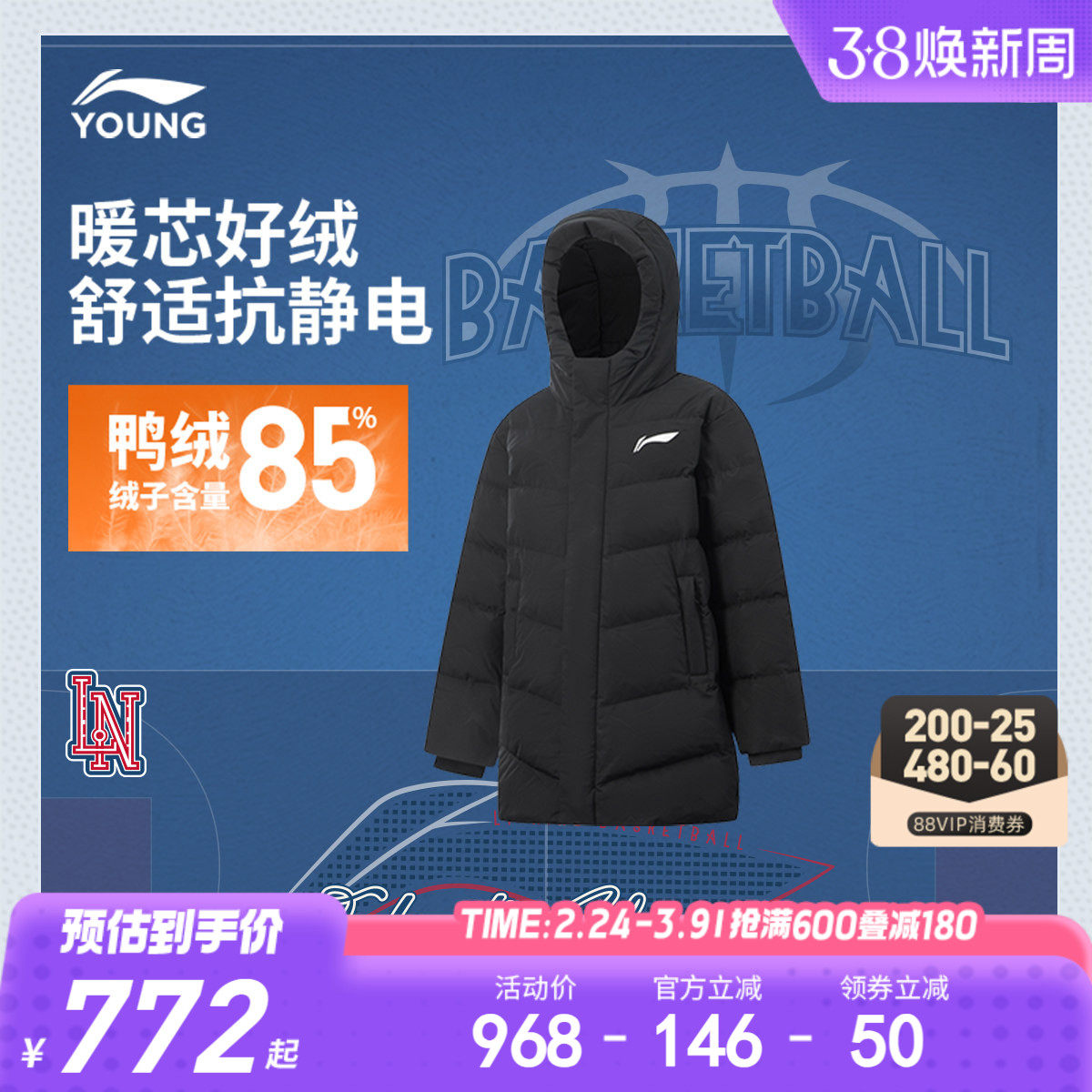 商场同款|李宁儿童中长羽绒服男大童男孩外套连帽宽松冬装运动服