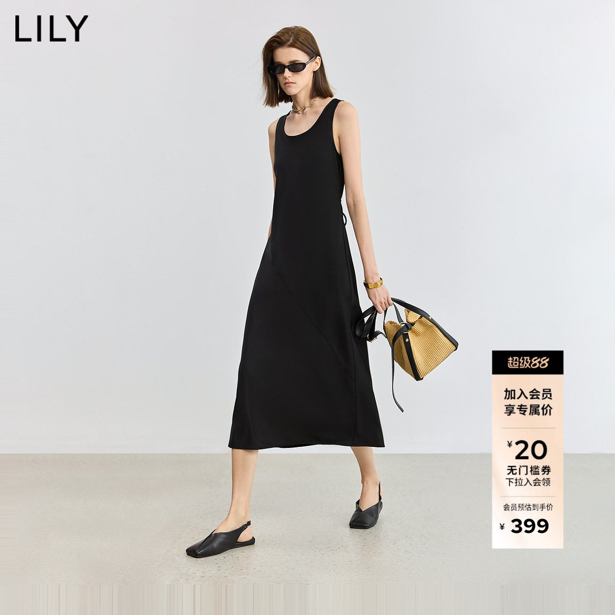 LILY2026新款女装简约气质斜裁百搭通勤无袖收腰背心吊带连衣裙