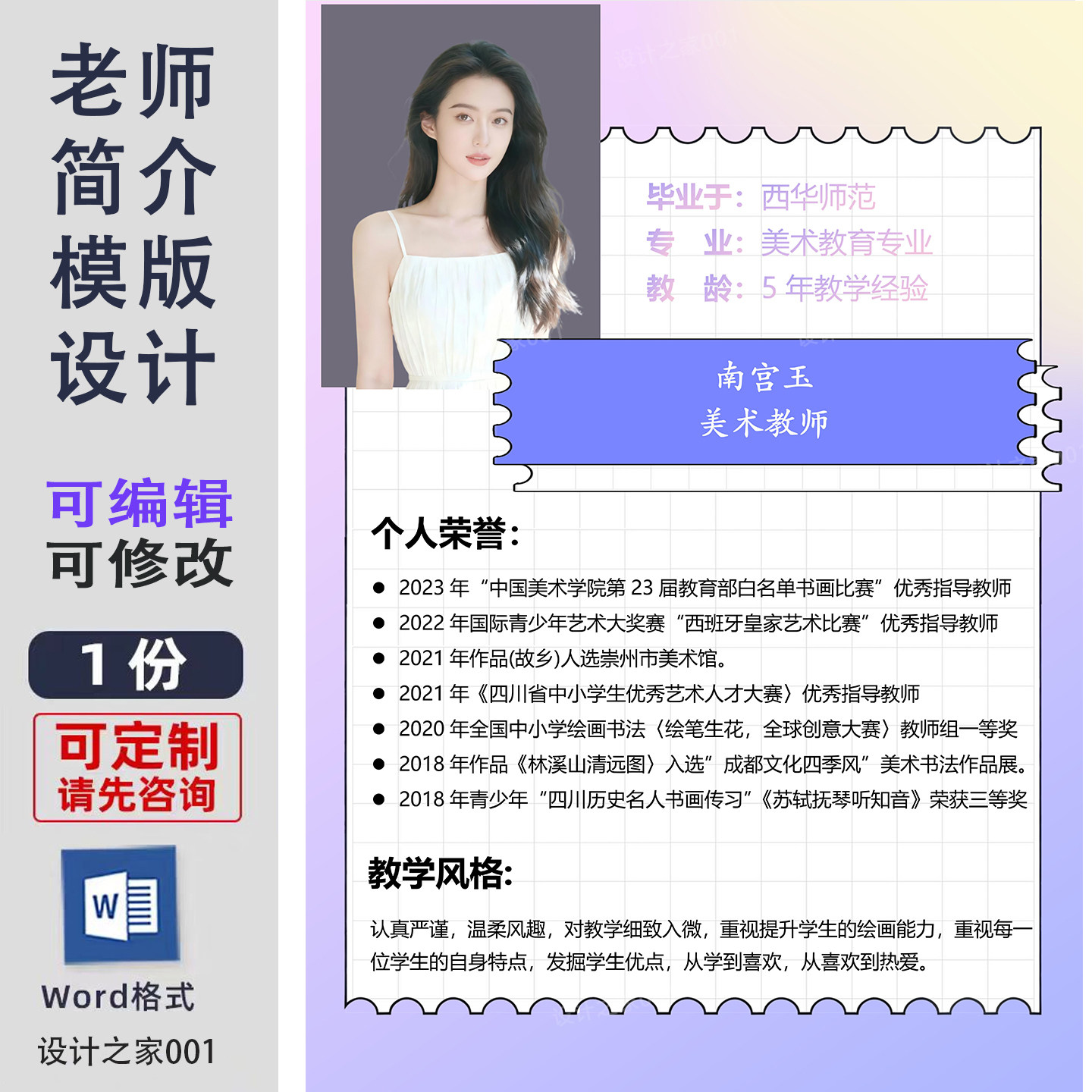 个人简历模板设计制作美术教师可编辑定制Word格式老师简介电子版