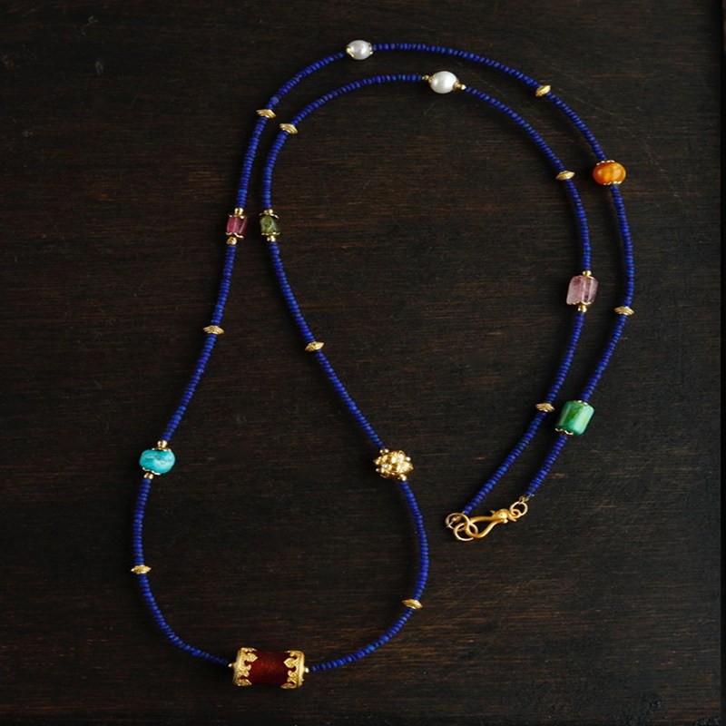极细青金石多宝项链两用款多圈搭配仿珍珠碧玺手链复古高级感饰品