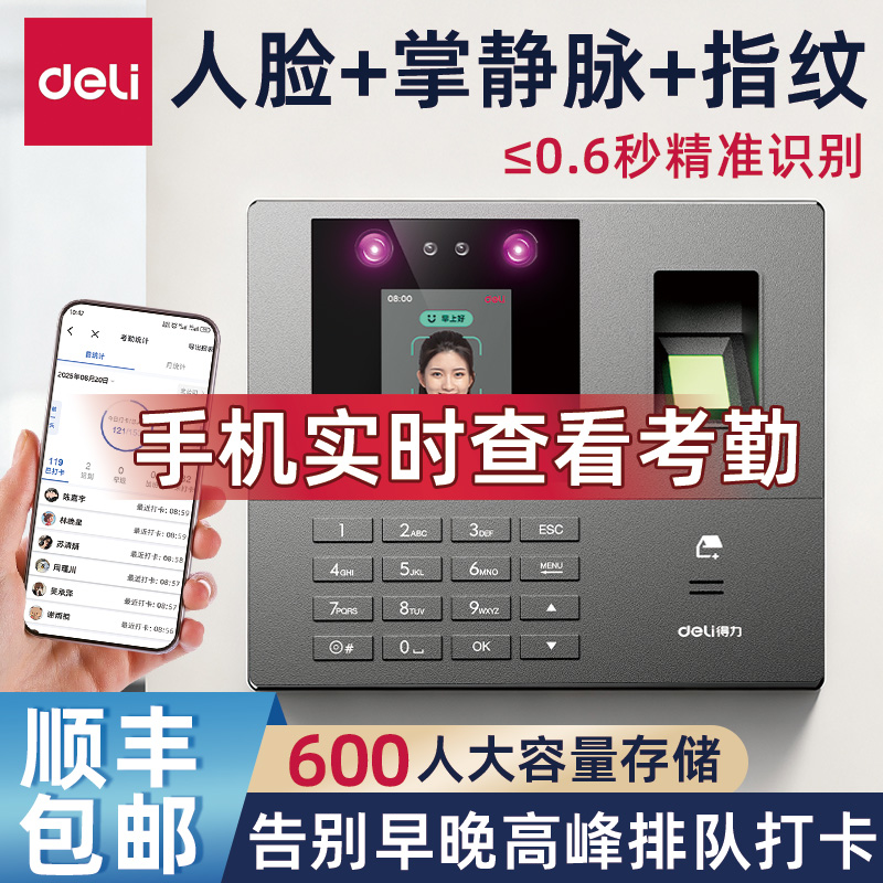 得力员工打卡考勤机人脸识别打卡机办公室食堂员工上下班掌静脉识别签到器工地免接触面部刷脸掌纹指纹一体机