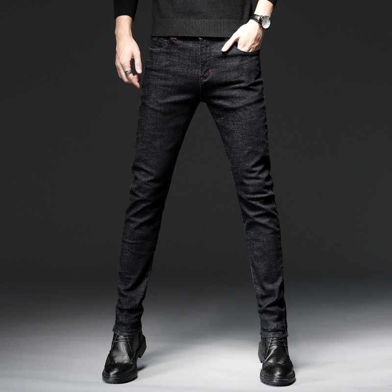 秋冬牛仔裤男黑色高弹力青年秋季加绒加厚商务休闲长裤子修身直筒