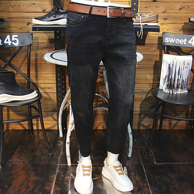 秋季百搭黑色修身青年男裤小脚牛仔裤韩版学生潮牌弹力紧身长裤子