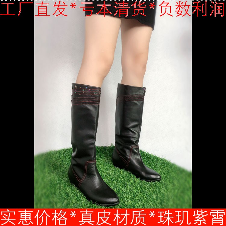 玮保/全真皮 平跟圆头高筒骑士靴女 防水台一脚蹬直筒靴长靴冬新