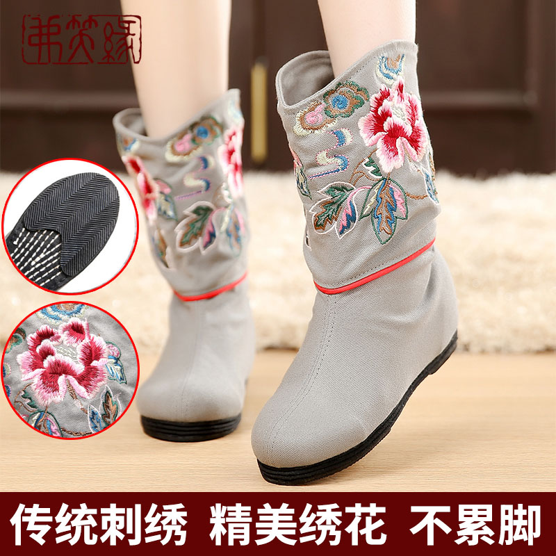 老北京布鞋女长筒靴平跟民族风女鞋妈妈鞋复古绣花鞋布鞋富贵牡丹