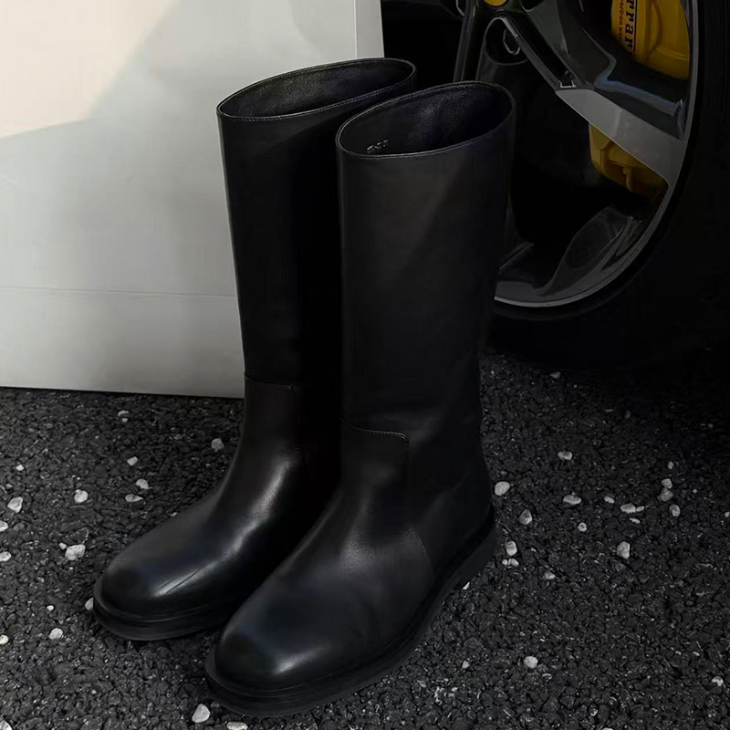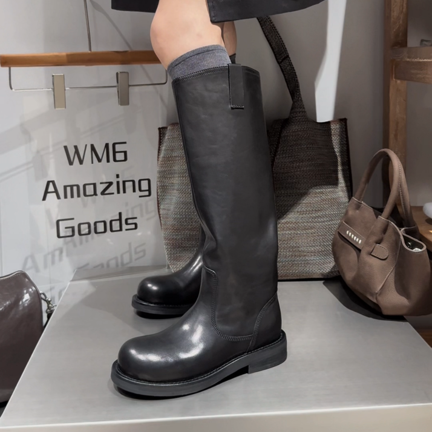 WM6欧洲站欧货真皮女靴2025秋季新款平跟圆头马丁靴骑士靴长靴潮