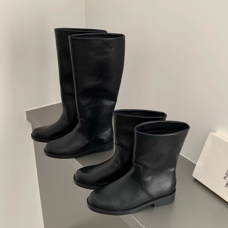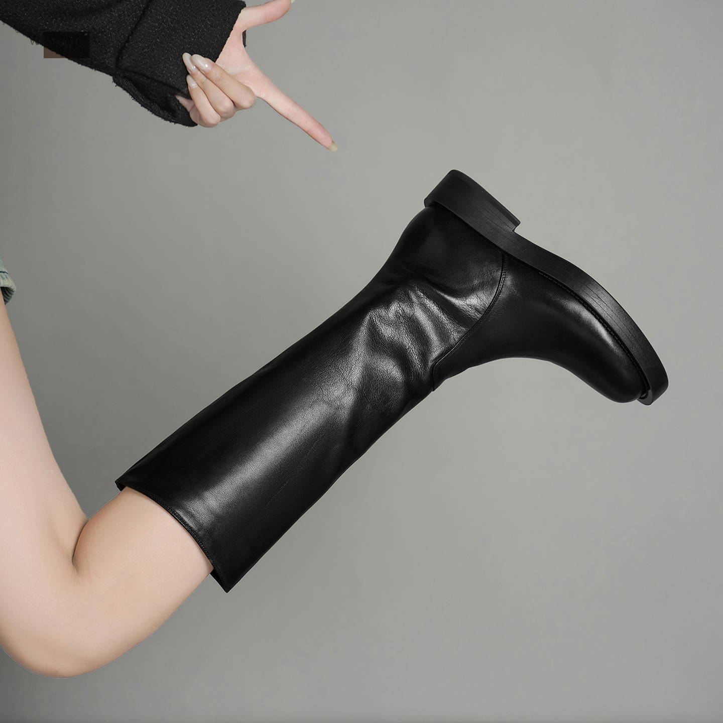 BULAGE极简风黑色套筒不过膝长靴加绒秋冬新款真皮平跟中筒骑士靴