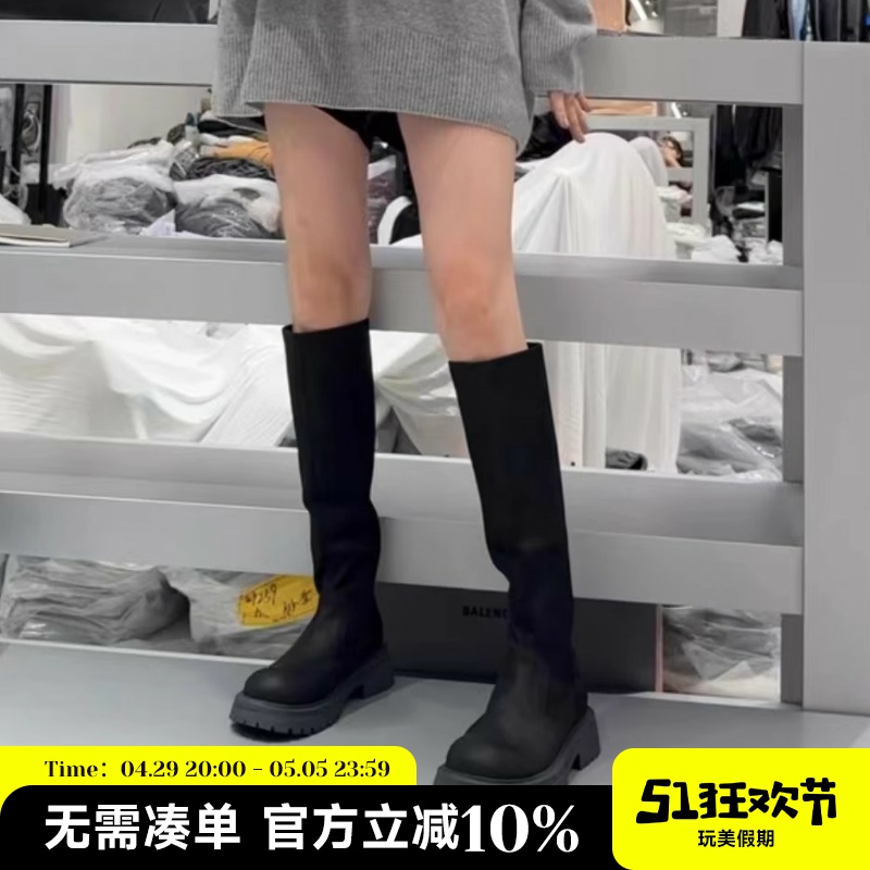 2024新款欧美英伦后拉链平跟高筒靴复古韩版骑士长靴不过膝直筒靴