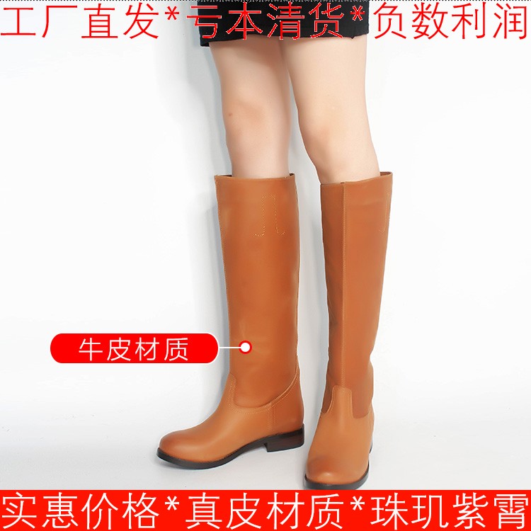 全真皮长靴子女冬圆头平跟套筒头层牛皮复古棕沙漠马靴240014075