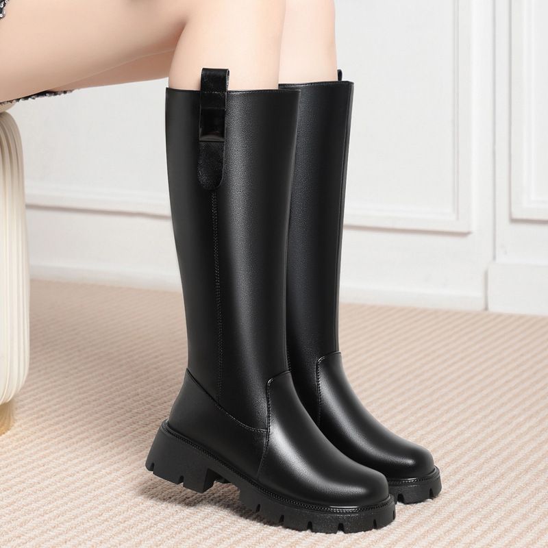 真皮厚底长筒靴女2025年秋冬季新款平跟粗腿百搭欧美风高筒骑士靴