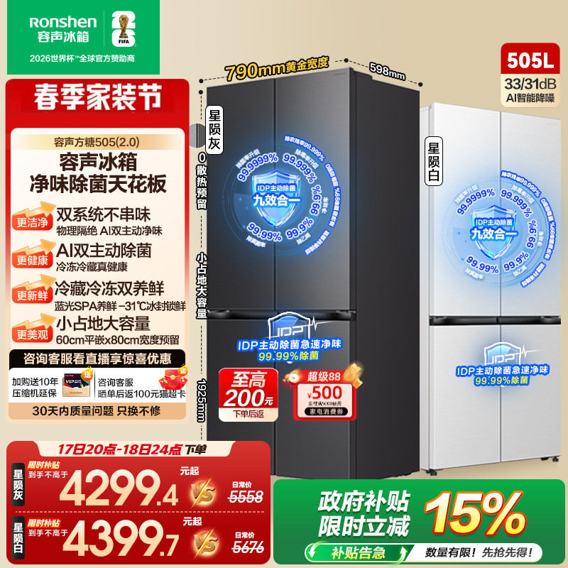(新品)容声方糖505L(2.0)主动双净双系统十字门超薄嵌入家用冰箱