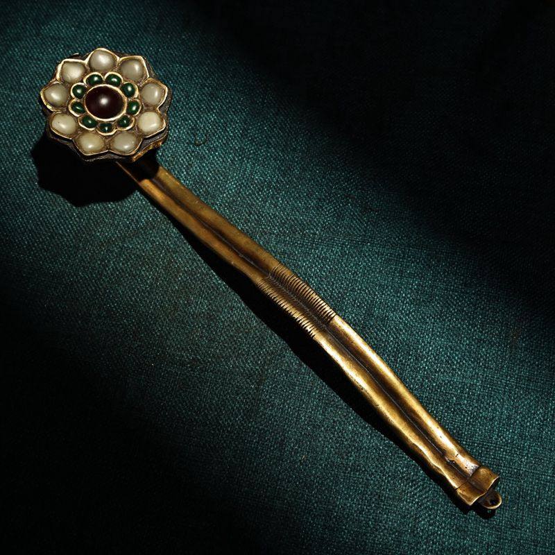 古玩收藏纯铜镶嵌玉石纯铜荷花如意铜器工艺品家居玄关装饰品摆件