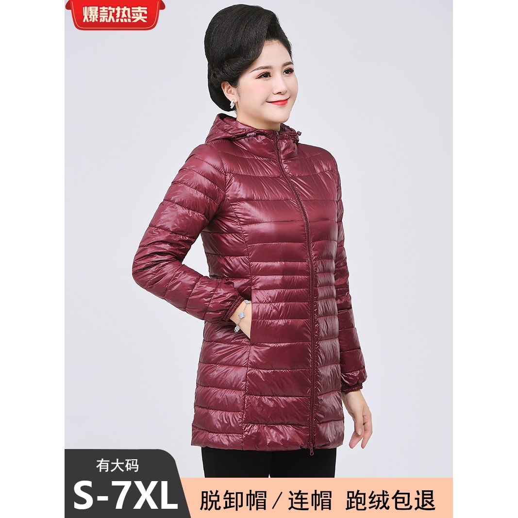 大码超薄羽绒服女妈妈轻薄中长款连帽白鸭绒超轻便修身显瘦中老年