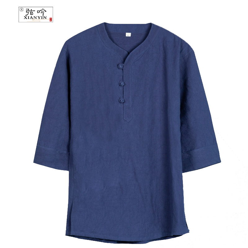 中国风春夏宽松高档男士亚麻短袖棉麻休闲透气5分半袖衬衫领t恤男