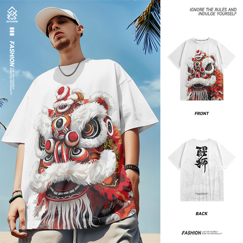 夏季新款国潮休闲短袖t恤男士宽松薄款打底衫中国风醒狮男装上衣