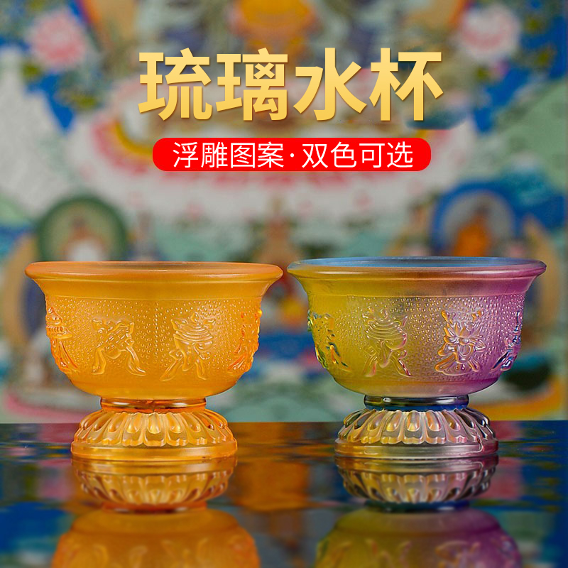 藏村彩色琉璃供水碗 佛前供水杯家用莲花圣水杯 观音财神贡杯摆件
