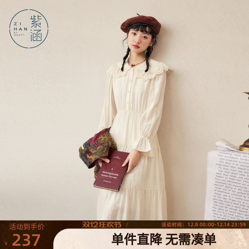 紫涵镂空娃娃领连衣裙女秋季新款甜美休闲收腰喇叭袖A字中长裙子