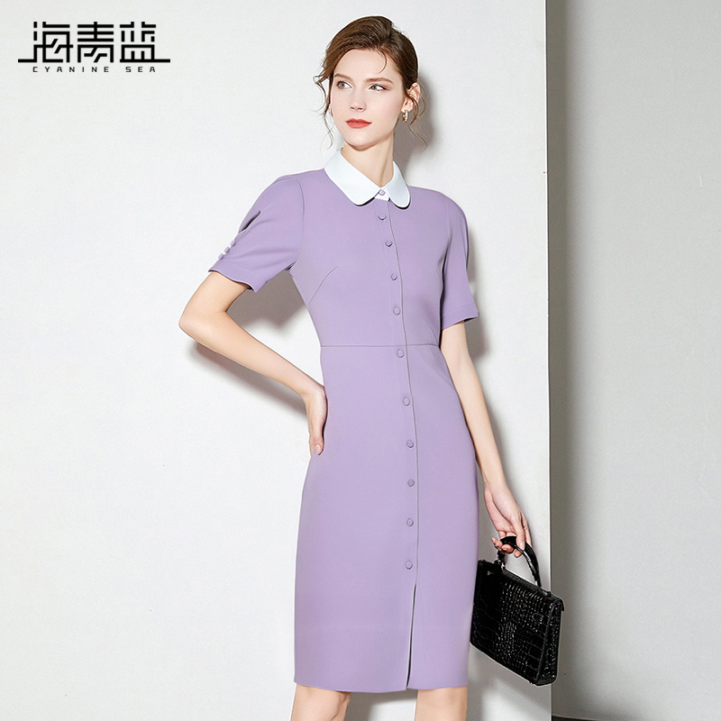 海青蓝气质娃娃领连衣裙女2025夏装新款设计感泡泡袖紫色中长裙
