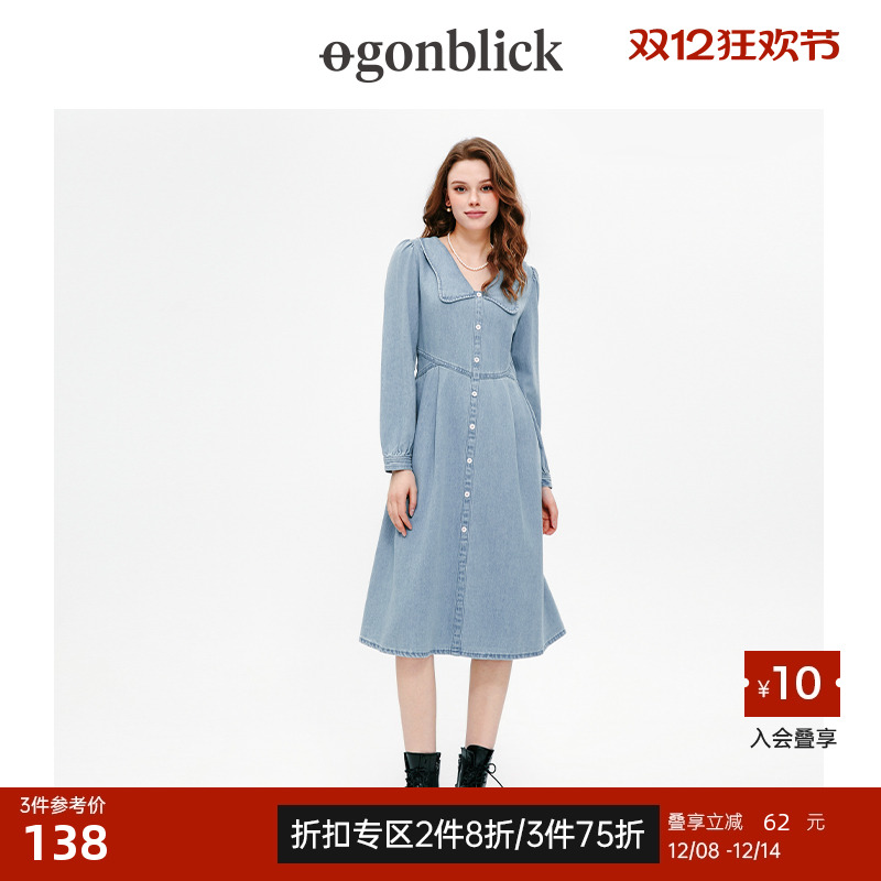 北欧时刻2025春季新款娃娃领牛仔连衣裙女收腰a字中长裙复古气质