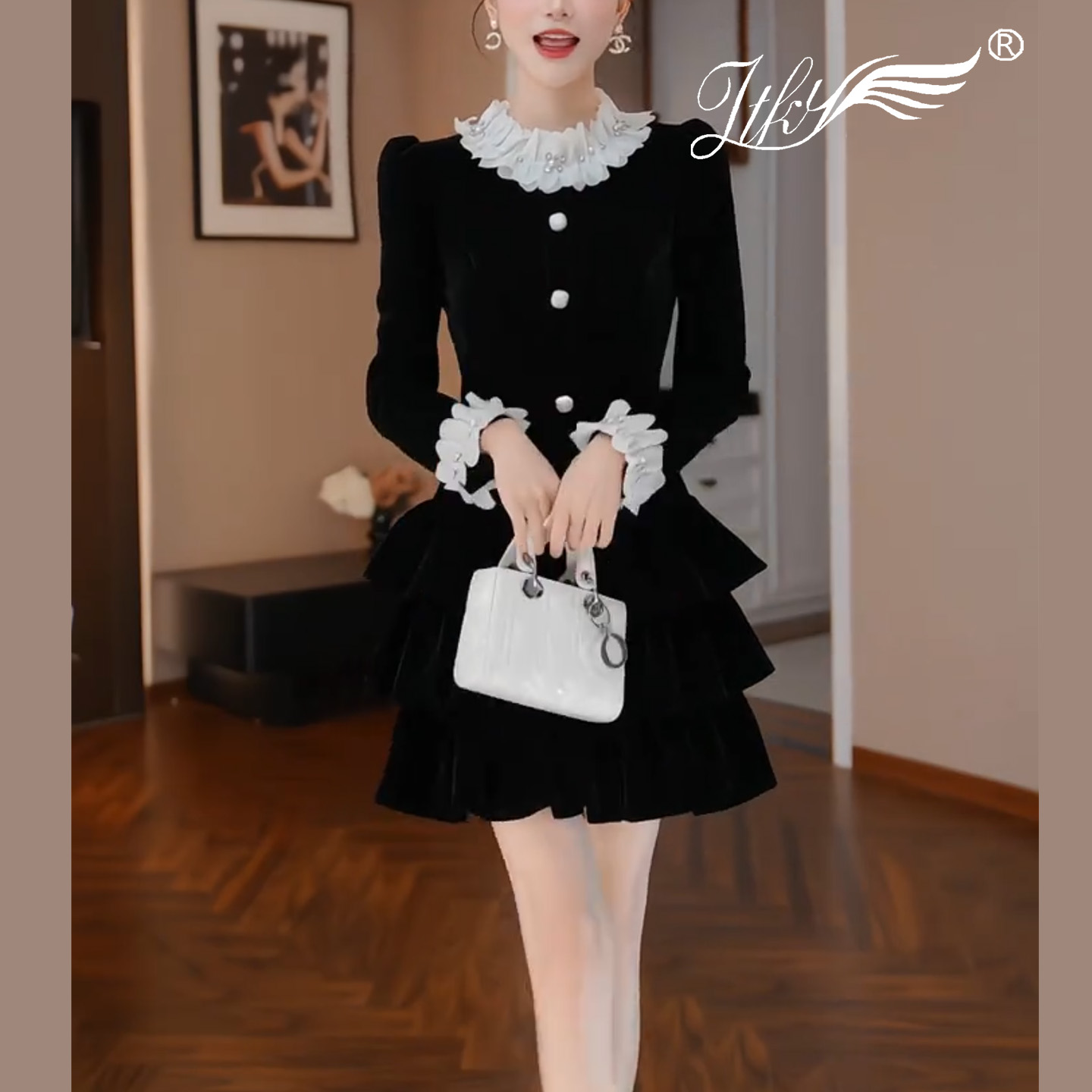 2025冬季新款千金风黑色连衣裙女高级感娃娃领中长款小个子蛋糕裙