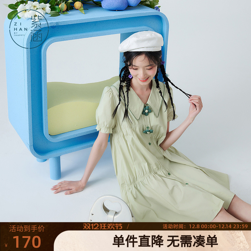 紫涵翻领A字连衣裙夏季新款泡泡袖撞色抽褶娃娃裙中长裙甜美休闲