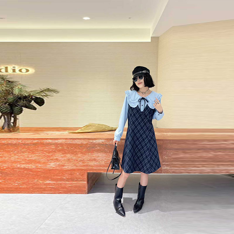 大码连衣裙女春秋新款马甲长袖假两件娃娃领设计感气质显瘦中长裙